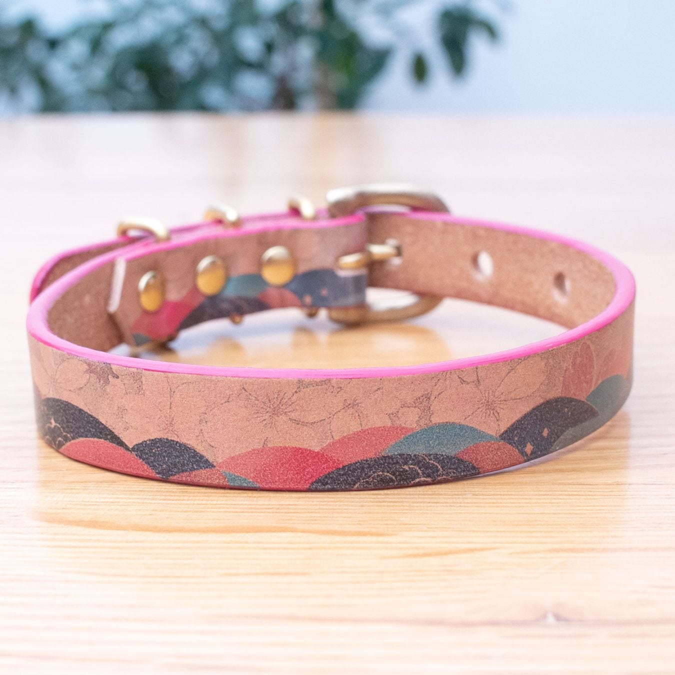 Framer エッジカラー(マゼンタ) アートなグラフィック本革首輪 和柄山桜 真鍮無垢金具 サイズSS~L ベルト幅16mm #...