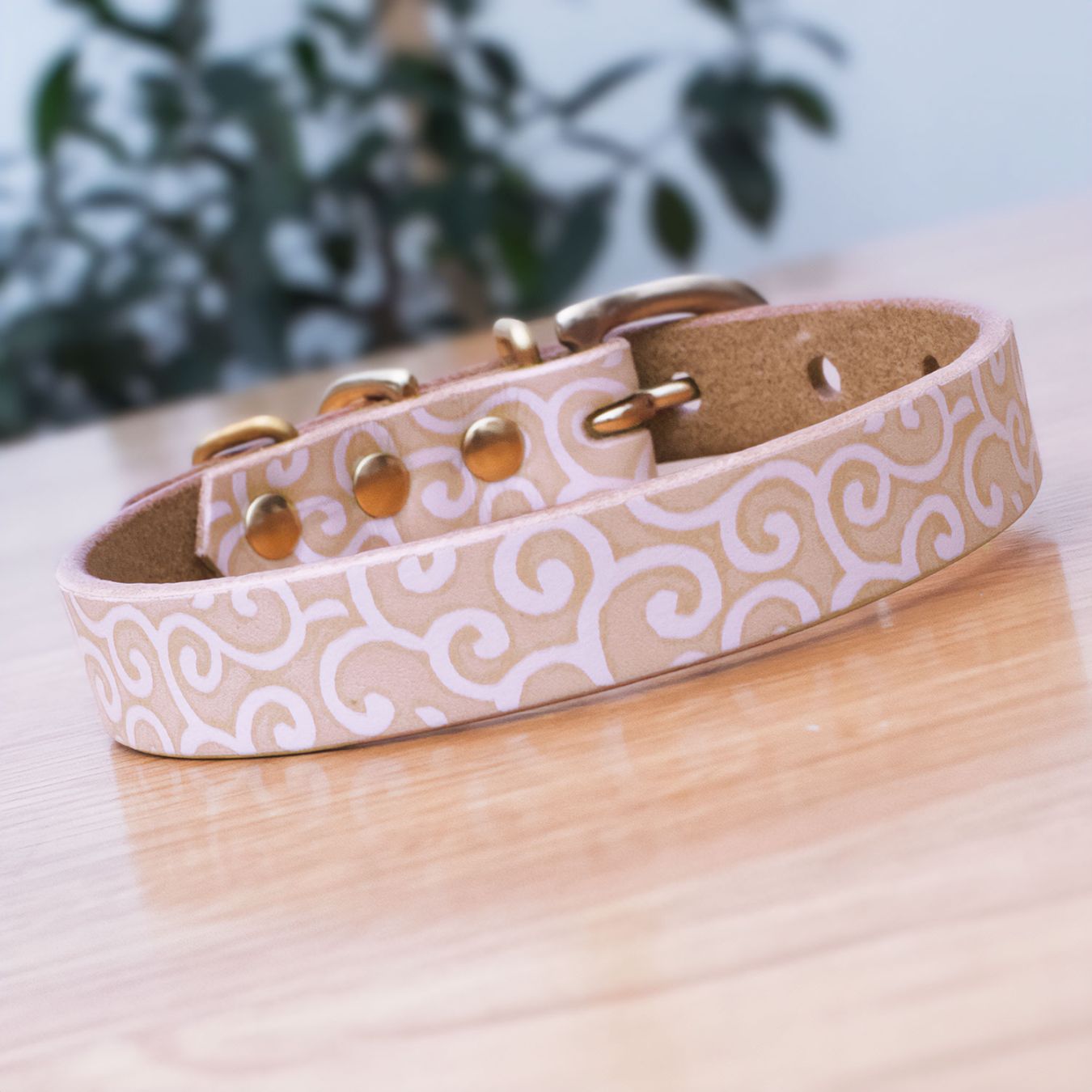 NUMETHAN 白紋グラフィック本革首輪(ホワイト柄) 白唐草 真鍮無垢金具 サイズSS~L ベルト幅16mm #4101