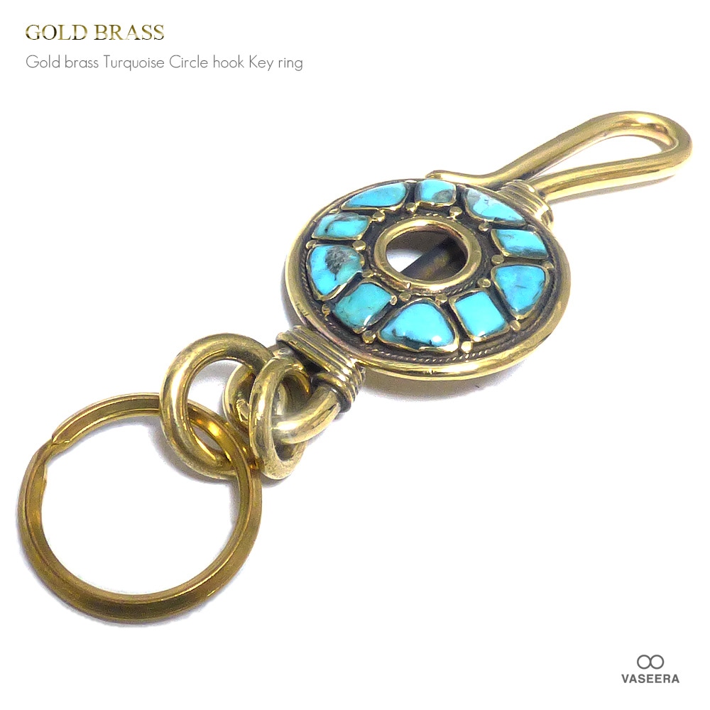 ゴールドブラス(真鍮) ネイティブ系 ターコイズ埋め込み(クラスター)サークル 30mm二重カン付き ベルトフック キーホルダー ...
