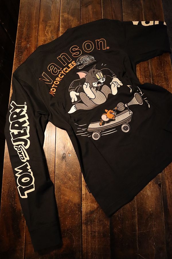 VANSON×Tom and Jerry トムとジェリーコラボ TJV-2303 天竺ロンTee 刺繍長袖Tシャツ ブラック