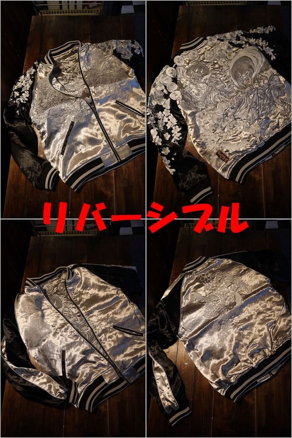 絡繰魂 からくり魂 231004 風神雷神 刺繍 和柄 リバ-シブル スカジャン シルバー×ブラック