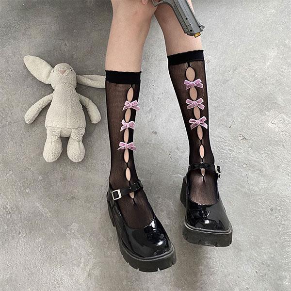 レディース リボン付き ソックス フリーサイズ 膝丈 靴下 ショート丈 網タイツ シアー 透け感 キュート ゴスロリ ロリータ コ...