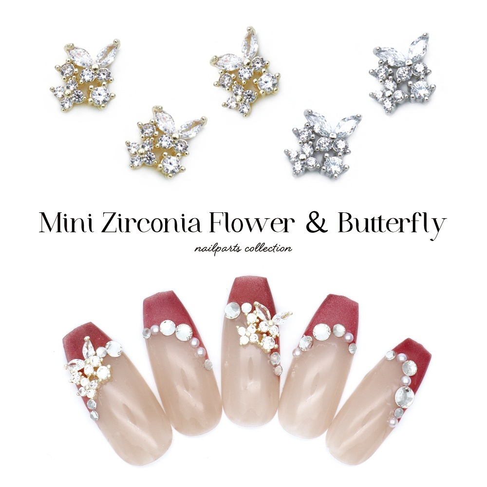 【ネコポス送料無料】ネイルパーツ ジルコニア製 ミニジルコニアフラワー&バタフライパーツ [ゴールド/シルバー] 2個入り
