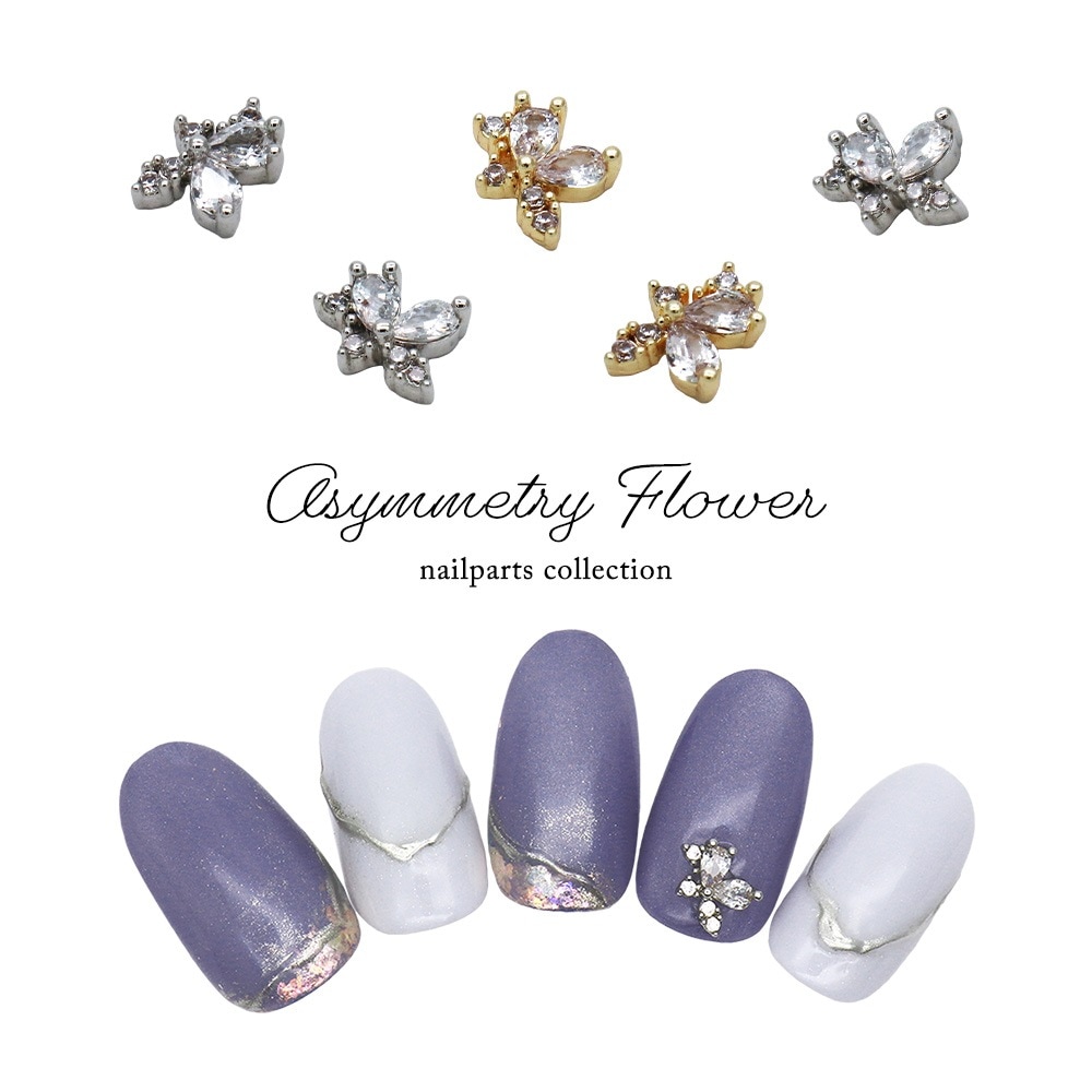 【ネコポス送料無料】ネイルパーツ ジルコニア製 アシンメトリーフラワーパーツ [ゴールド/シルバー] 2個入り