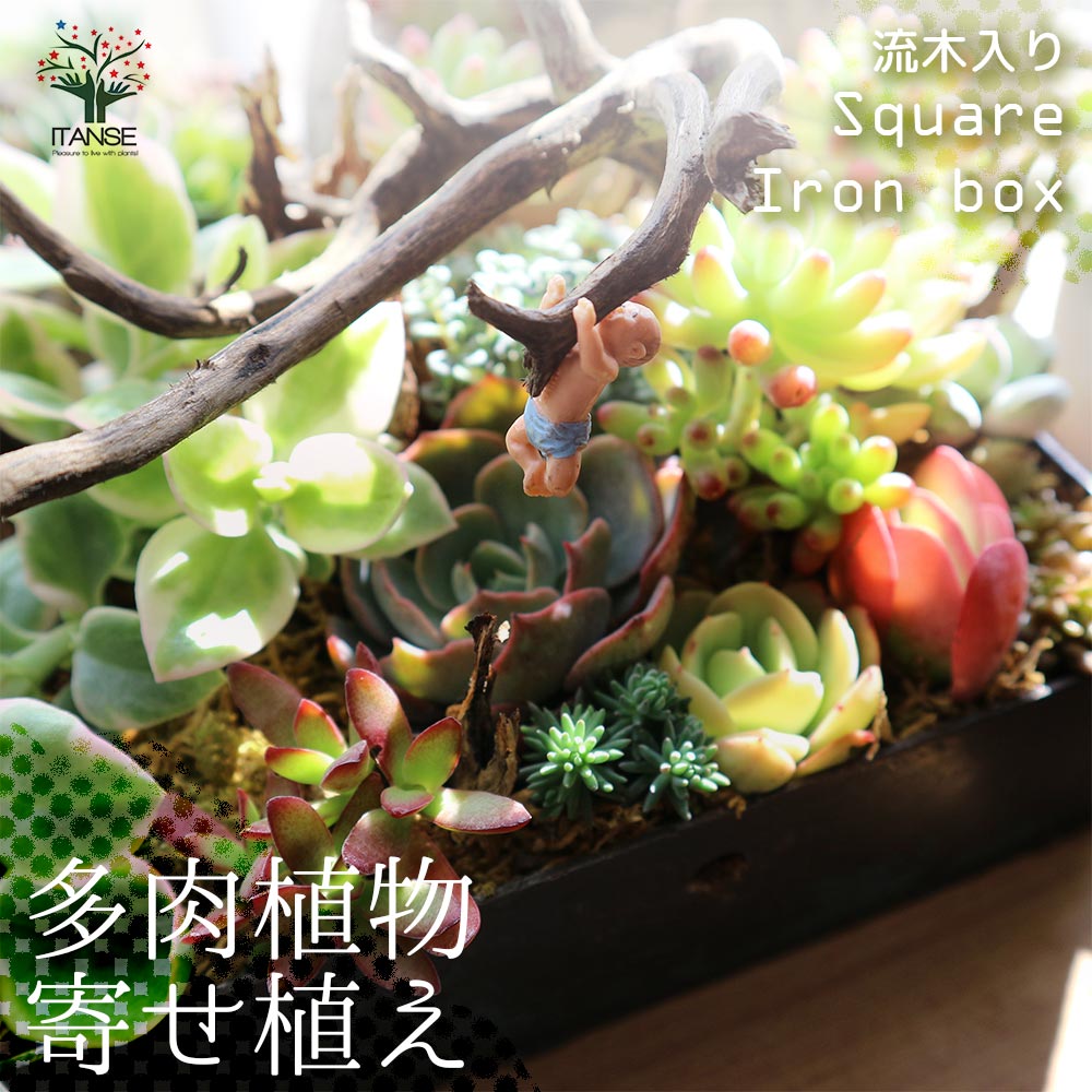 多肉寄せ植え 流木入りスクエアアイアンBOX【多肉植物 サイズイメージ:高さ約16cm×幅約22cm×奥行約15cm/1個売り】