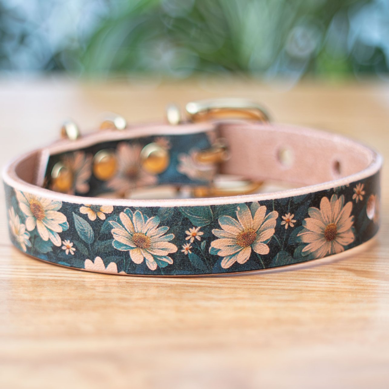 Framer アートなグラフィック本革首輪 デイジー花柄 真鍮無垢金具 サイズSS~L ベルト幅16mm #23489