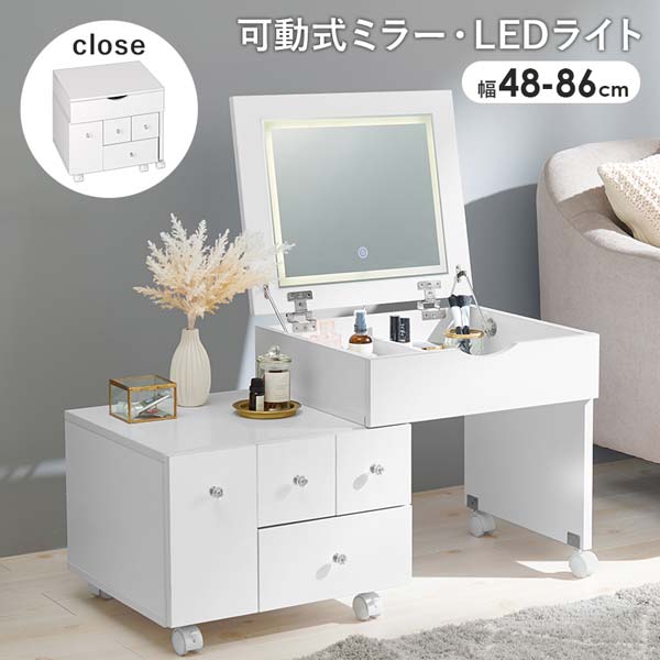 伸縮式コスメワゴン コスメボックス 鏡付き ドレッサー かわいい キャスター付 LEDライト付き