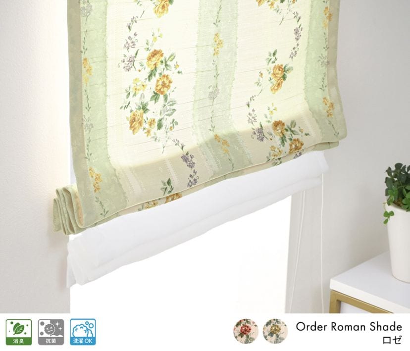 バラのデザインをプリントした小花柄ダブルシェード「ロゼ」グリーン