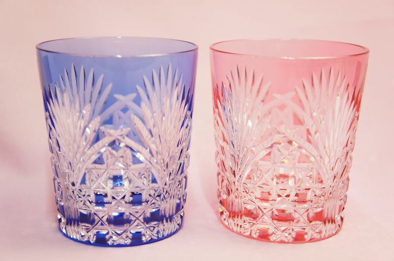 江戸切子 笹っ葉に四角籠目紋 ペアロックグラス
