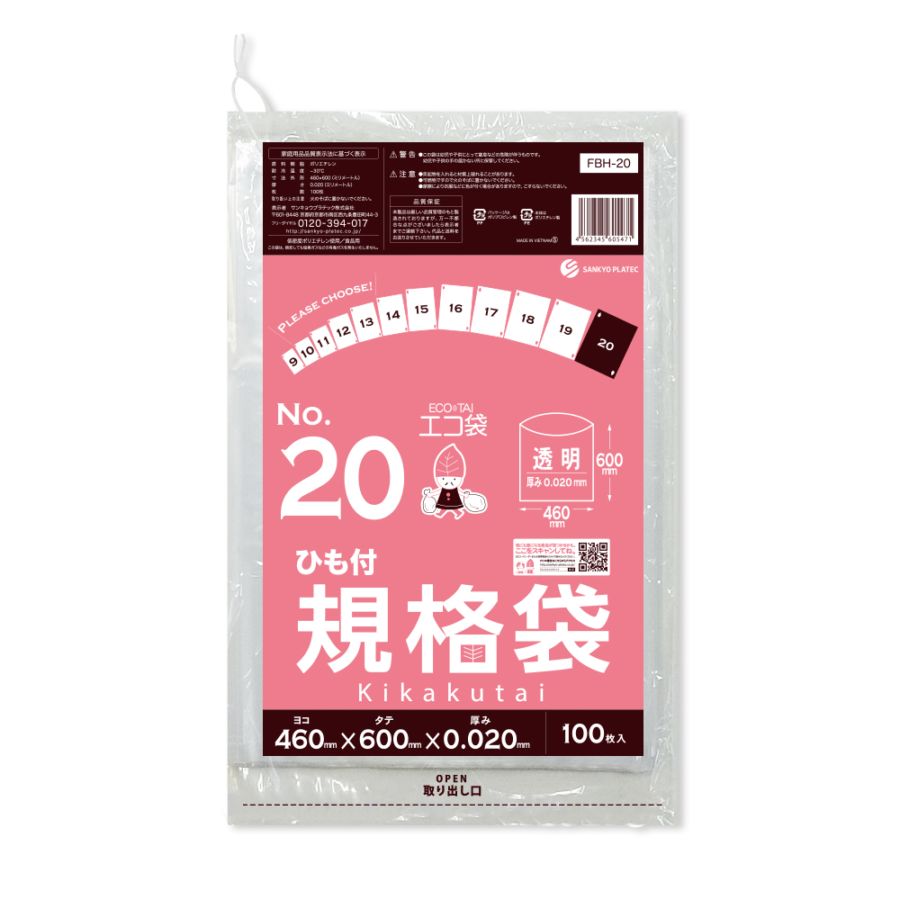 規格袋20号 ひも付 透明 0.020mm厚(100枚×15冊)