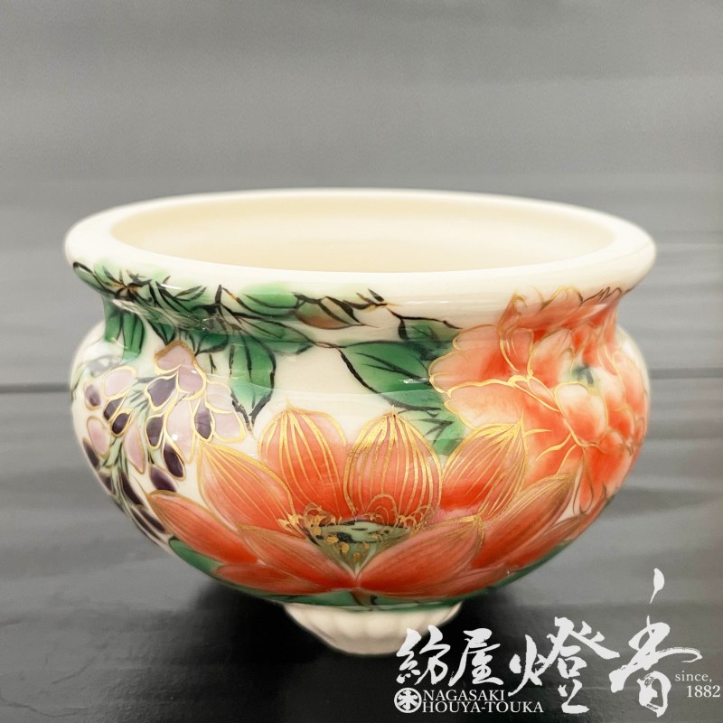 仏事具『仏前香炉【三華絵・腰袴香炉/蓮・藤・牡丹-SANKAE-】紙箱入[京焼・清水焼/陶葊]空焚用』龍心堂