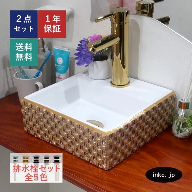 洗面ボウル おしゃれ モザイクタイル 金 ゴールド 四角 コンパクト 置き型 オーバーフロー無し W300×D290×H105 I...