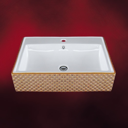 【廃番】洗面ボウル 陶器 四角型 置き型(オンカウンターシンク) モザイクタイル 金・ゴールド オーバーフロー有り W610×D4...