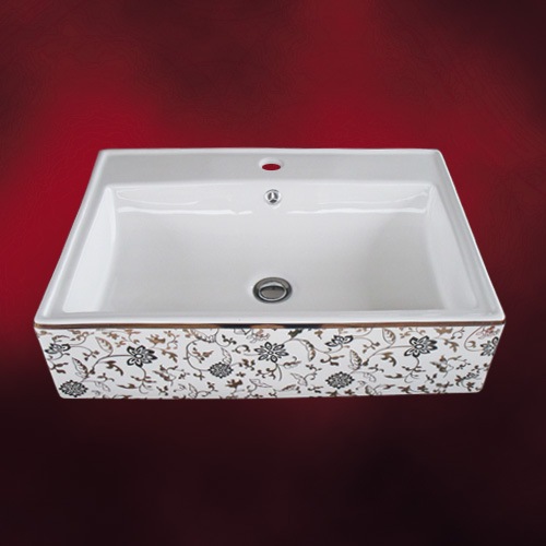【廃番】洗面ボウル 陶器 四角型 置き型(オンカウンターシンク) 金色 花柄 オーバーフロー有り W600×D455×H150 |...