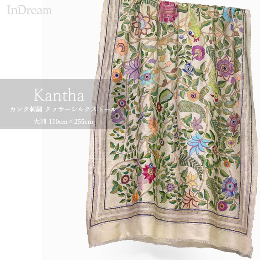 InDream カンタ 刺繍 ストール 約110×255cm スカーフ シルク インド 刺し子 インテリア テーブルクロス クリス...
