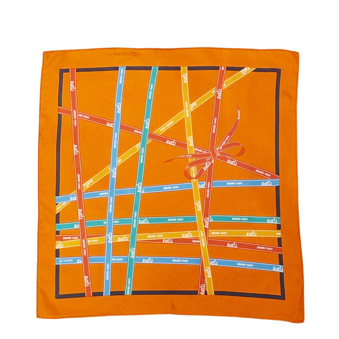 HERMES エルメス スカーフ カレ45 プチカレ 『BOLDUC(ボルデュック)』 リボン柄 シルク オレンジ