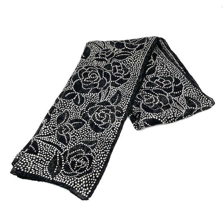 CHANEL シャネル シフォンストール カメリア シルク ブラック ホワイト
