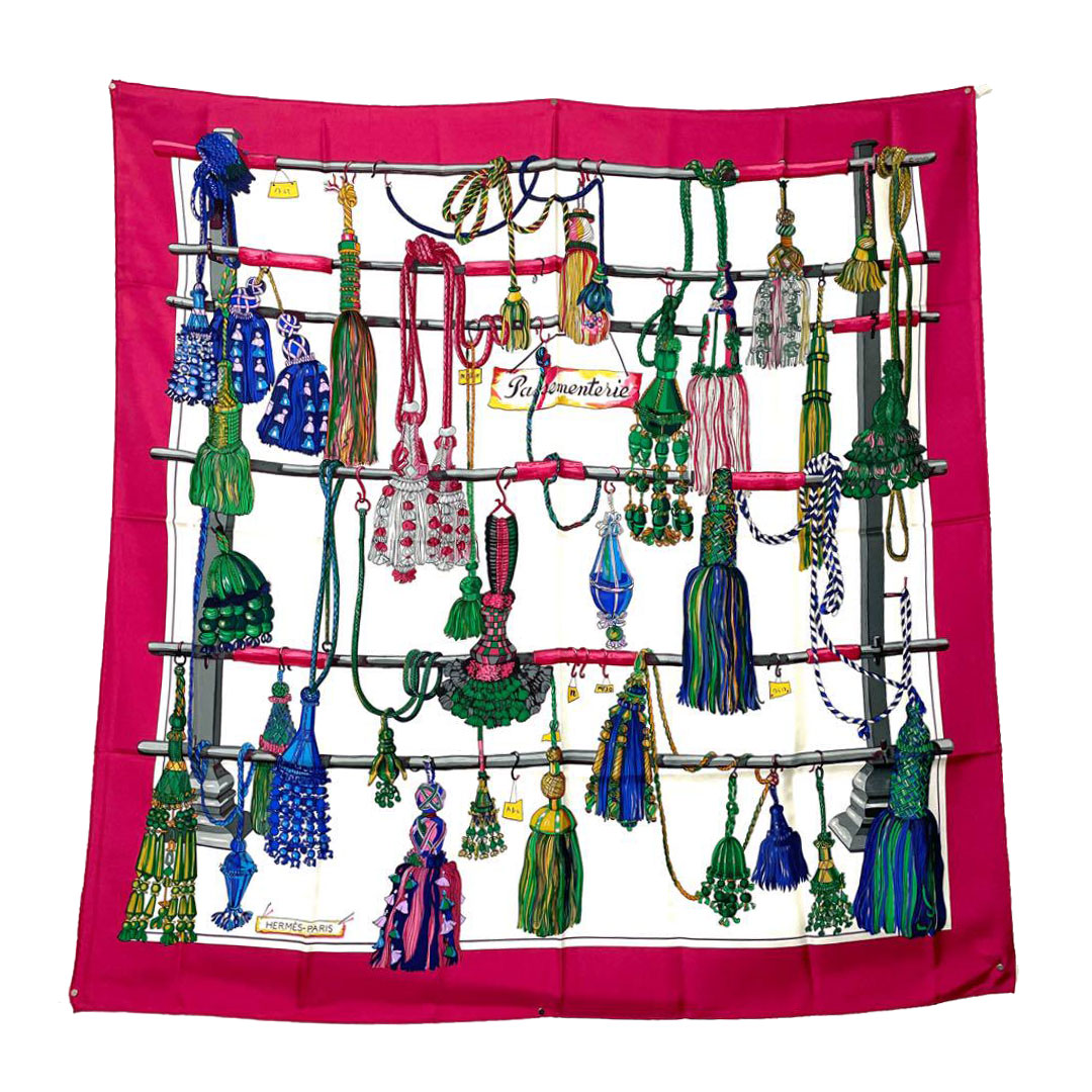 HERMES エルメス スカーフ カレ90 『Pasementerie(紐飾り)』 タッセル柄 シルク ホワイト ワインレッド系