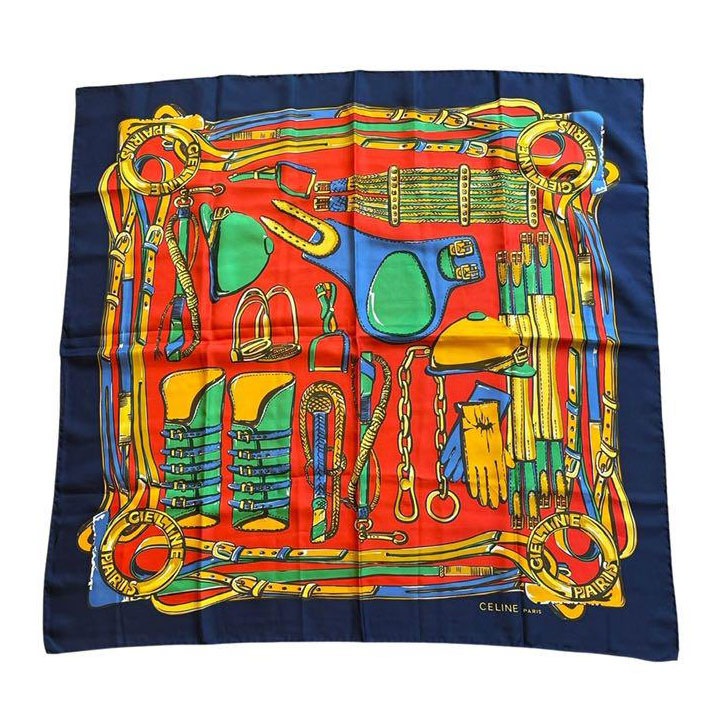 CELINE セリーヌ スカーフ 馬具柄 シルク ネイビー レッド ブルー グリーン イエロー