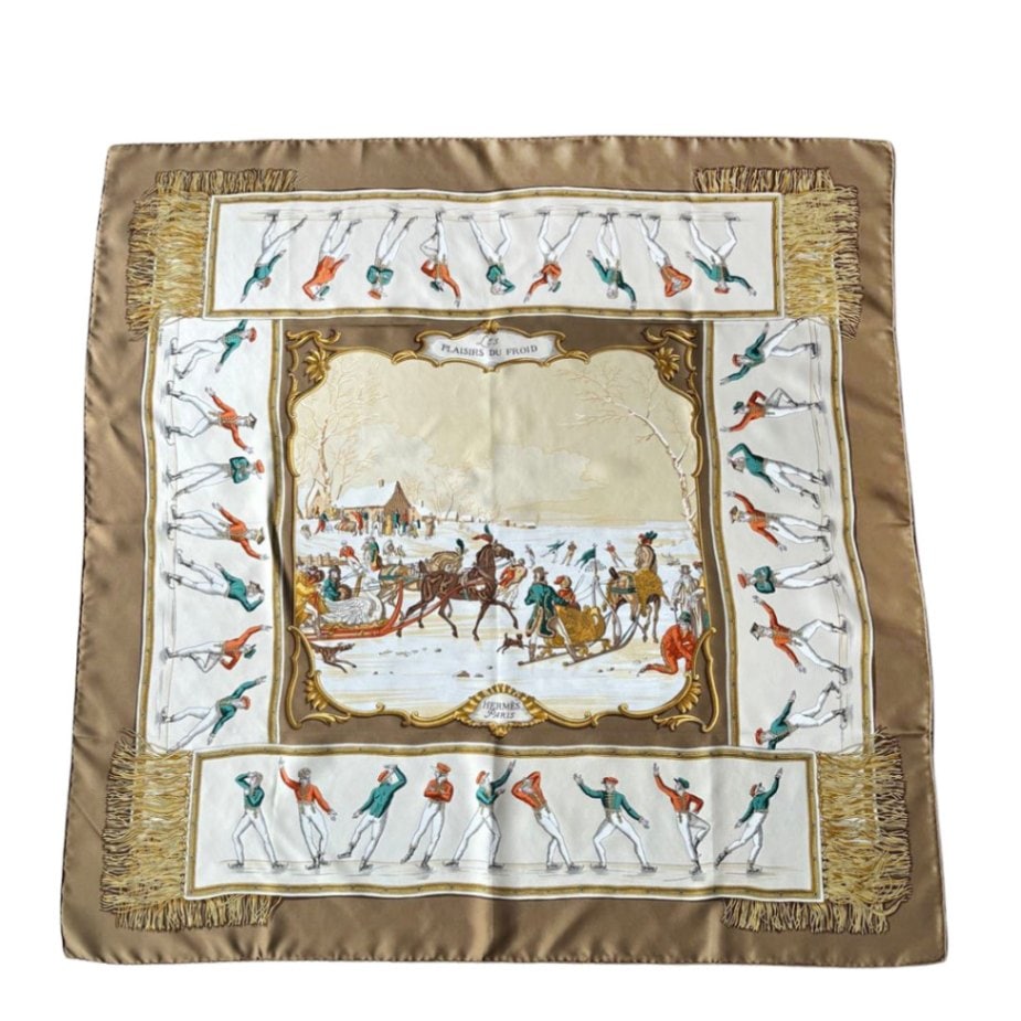 HERMES エルメス スカーフ カレ90 『LES PLAISIRS DU FROID(氷上の喜び)』 シルク ベージュ系