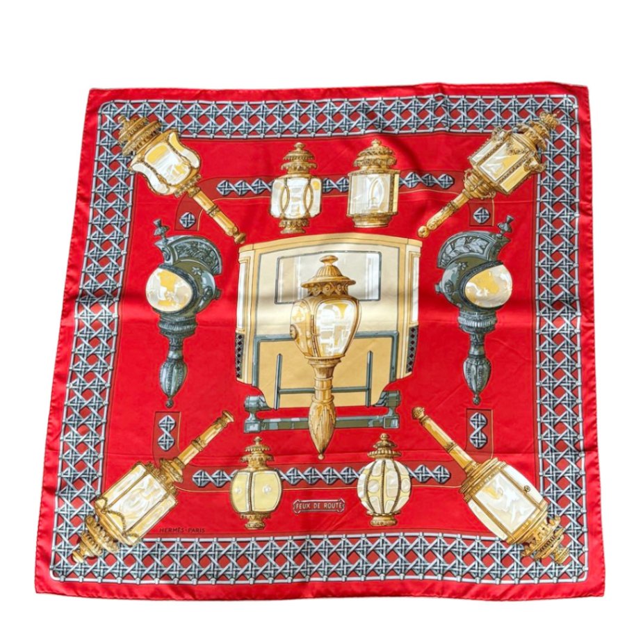 HERMES エルメス スカーフ カレ90 『FEUX DE ROUTE(馬車のランタン)』 シルク レッド系