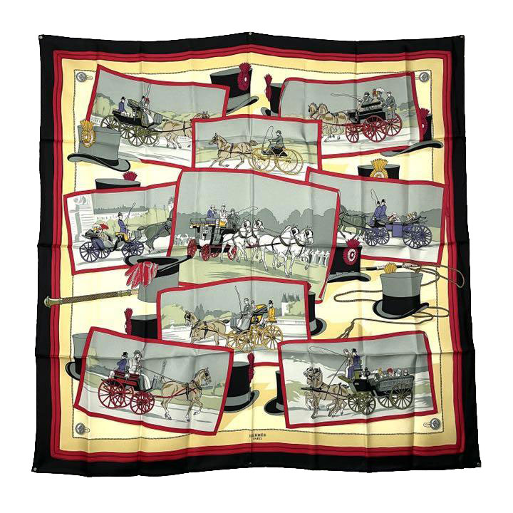 HERMES エルメス スカーフ カレ90 馬車 ハット 写真柄 シルク ブラック レッド イエロー系