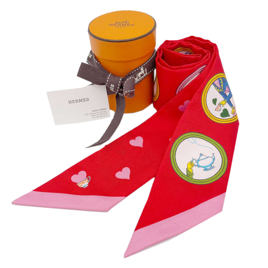 HERMES エルメス スカーフ ツイリー 『TEA TIME(ティータイム)』 シルク レッド ピンク
