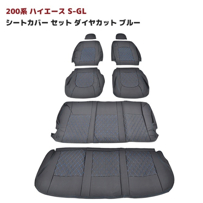 ハイエース 200系 S-GL シートカバー セット ダイヤカット ブルー ステッチ 運転席 助手席 後部座席セット