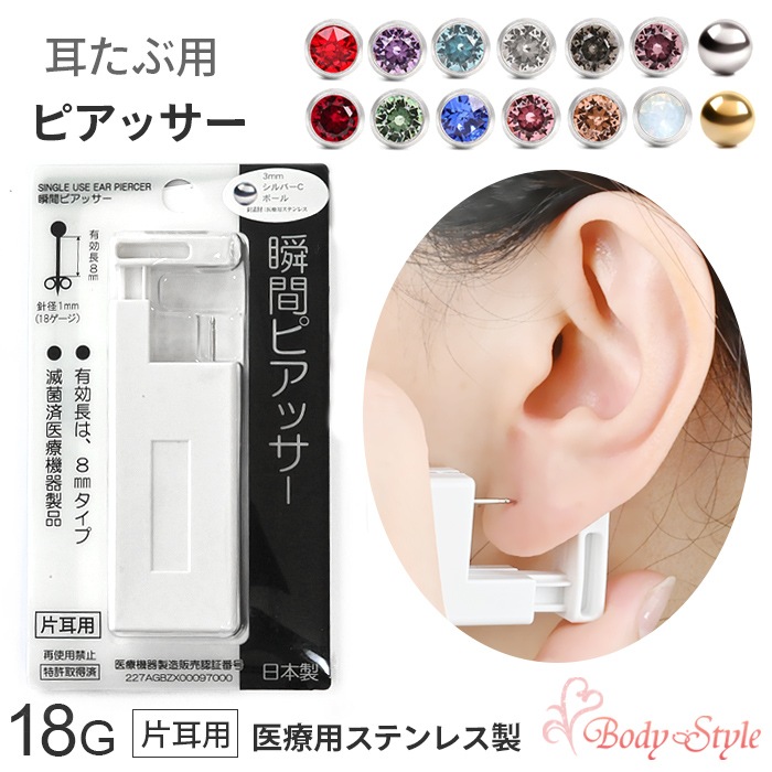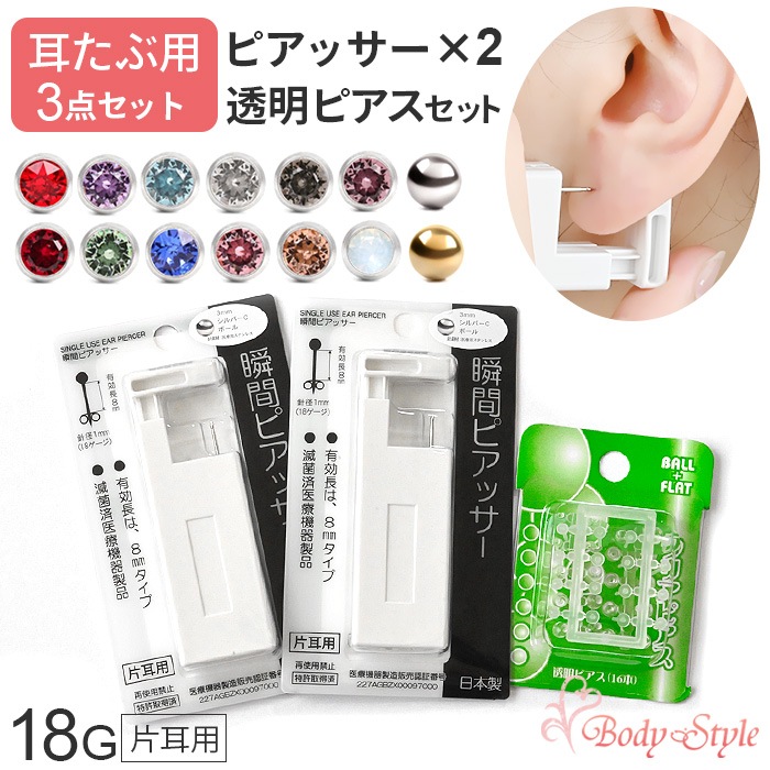 ピアッサー 18g 耳ピアス ボディピアス 耳用セット 3点セット 瞬間 医療用ステンレス製 透明ピアス クリアピアス 樹脂 穴...