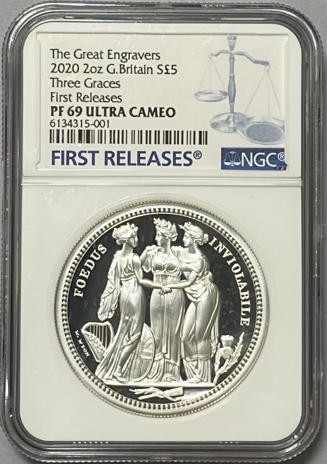 【動画あり】グレートブリテン 2020年 スリーグレイセス2オンス5ポンド銀貨 NGC PF70UCAM ファーストリリース オリ...