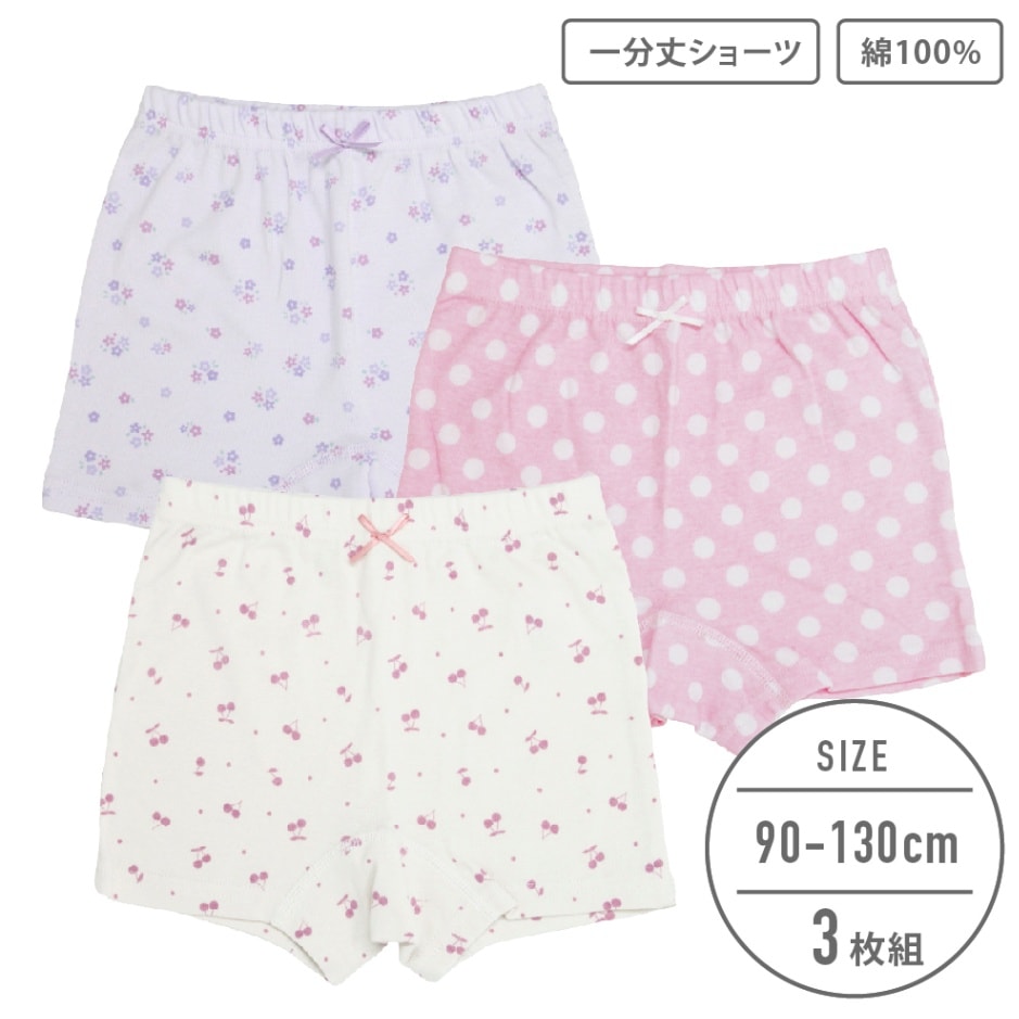 【女の子】キッズボクサーショーツ 3枚組 チェリー/ドット/フラワー 90~130cm【綿100%】