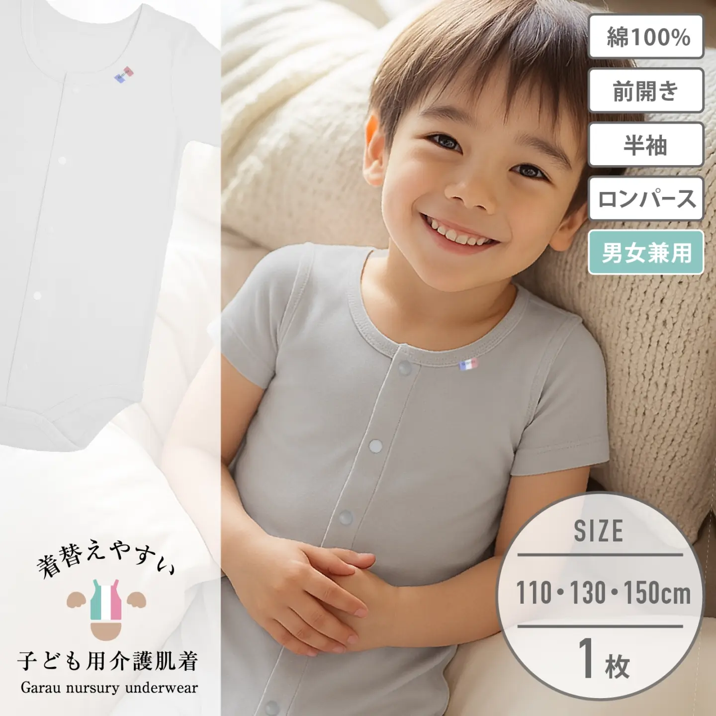 【男女兼用】着替えやすい子ども用介護肌着 前開きロンパース グレー 110cm・130cm・150cm【綿100%】
