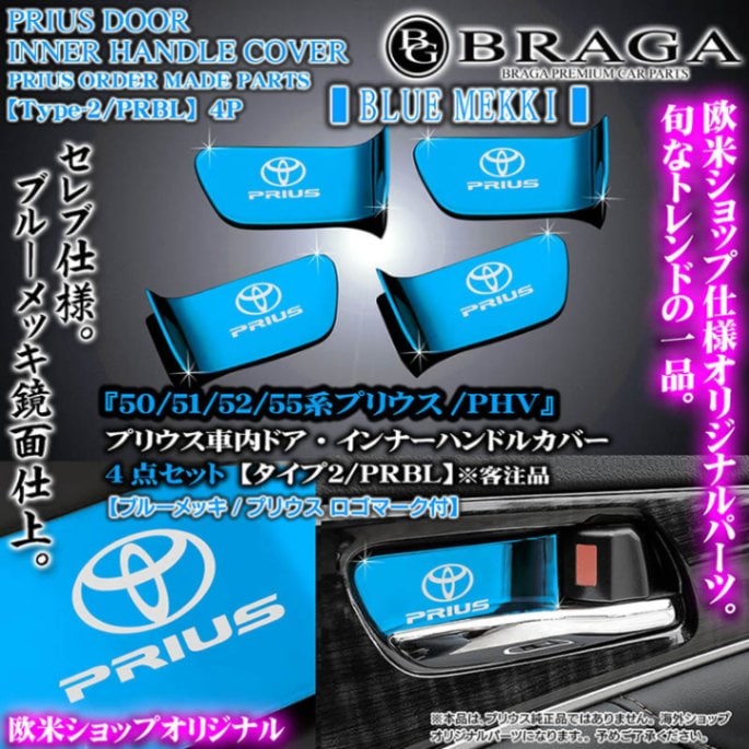 50系プリウス/PHV【タイプ2/PRBL】PRIUSロゴ&トヨタマーク付/客注品/車内ドア インナーハンドルカバー《ブルーメッキ...