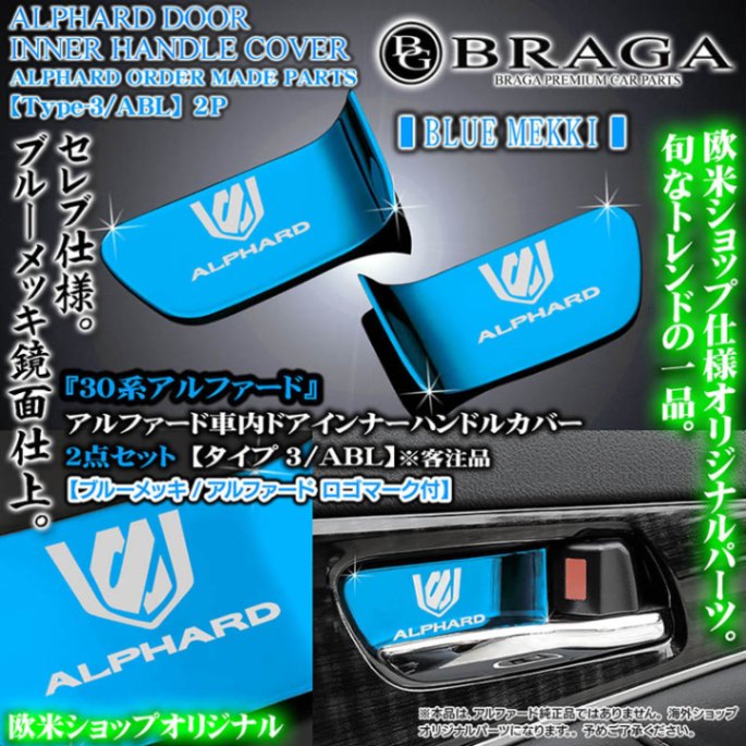 30系アルファード前期/後期【タイプ3/ABL】ALPHARDロゴマーク付/客注品/車内ドア インナーハンドルカバー《ブルーメッキ...