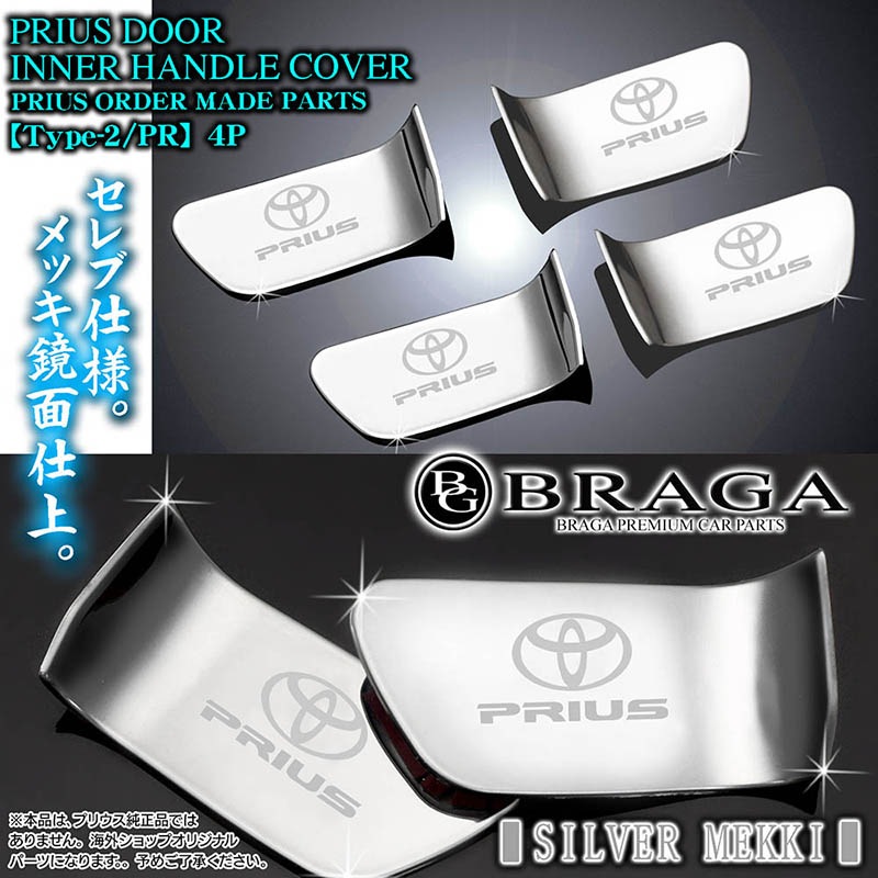 50系プリウス/PHV【タイプ2/PR】PRIUSロゴ&トヨタマーク付/客注品/車内ドア インナーハンドルカバー《シルバーメッキ》...