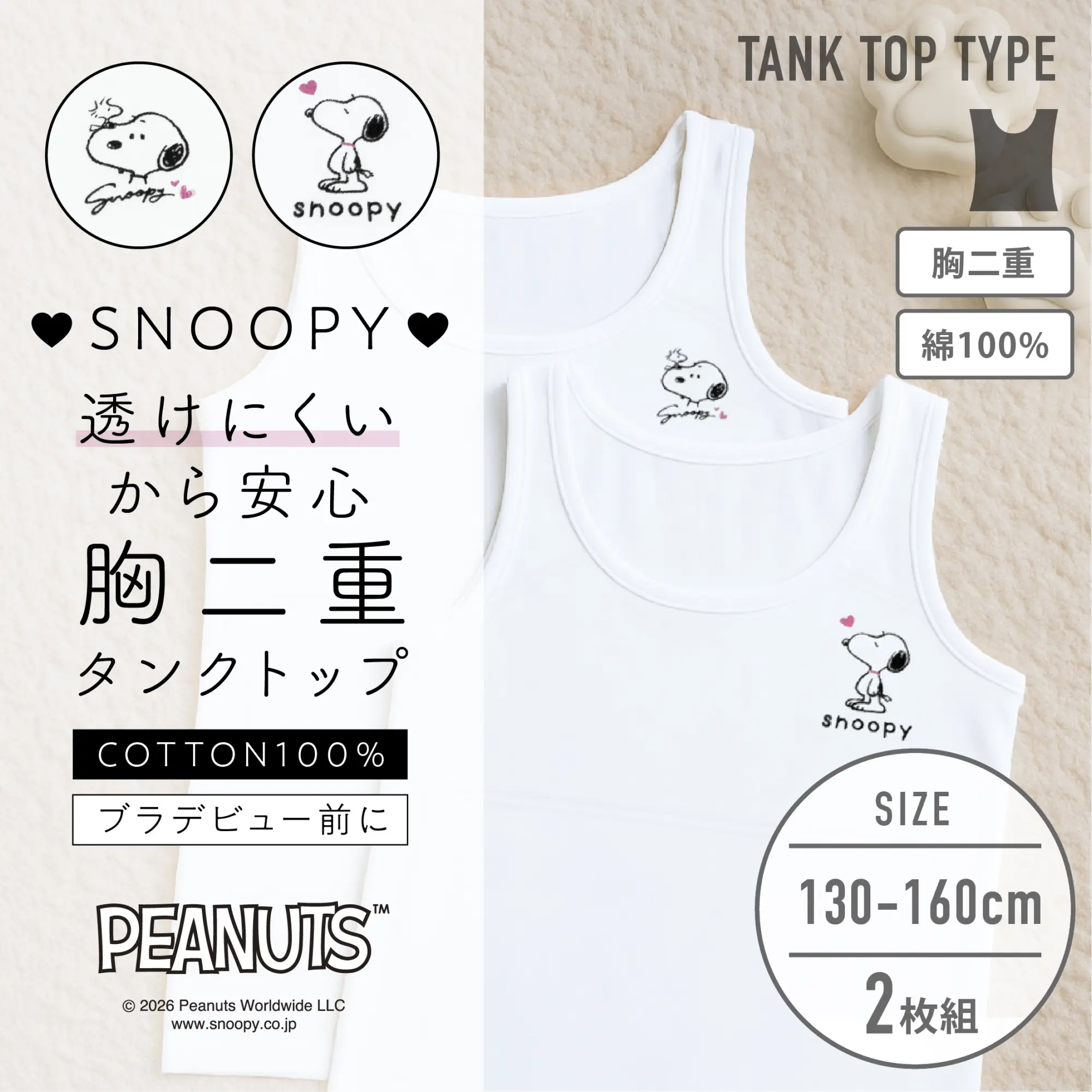 【女の子】スヌーピー 胸二重女児タンクトップ ジュニアブラ| 2枚組| 130cm・140cm・150cm・160cm【綿100%...