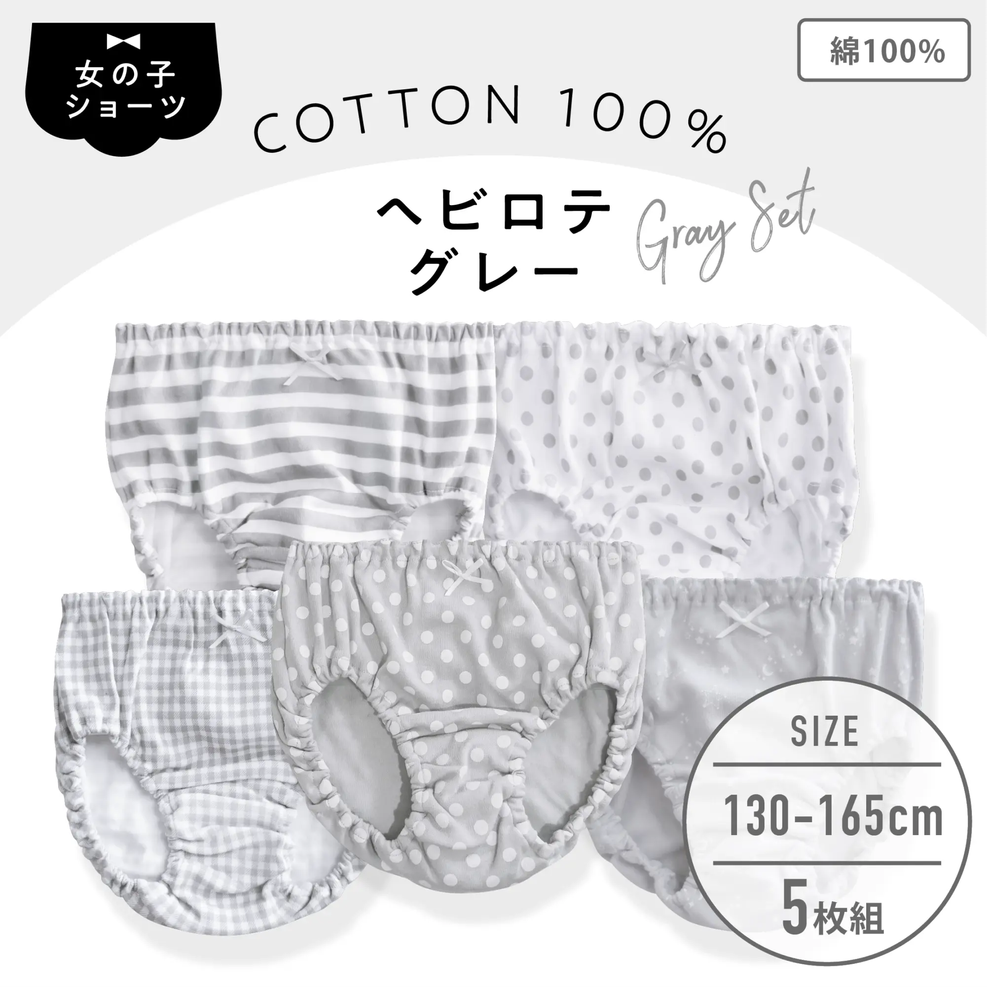 【女の子】ジュニアショーツ 5枚組 グレー総柄 130cm・140cm・150cm・160cm・165cm【綿100%】