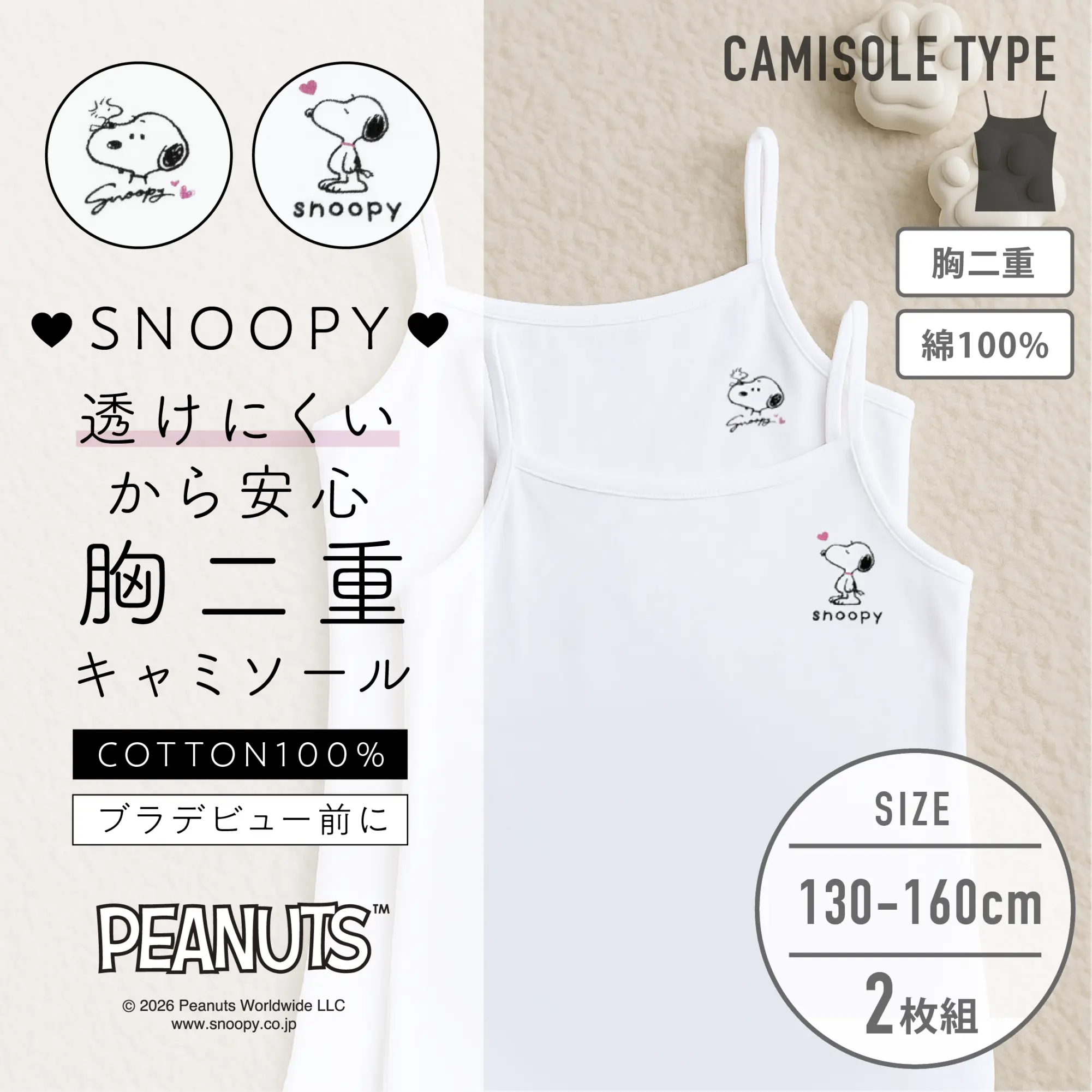 【女の子】スヌーピー 胸二重女児キャミソール ジュニアブラ| 2枚組| 130cm・140cm・150cm・160cm【綿100%...