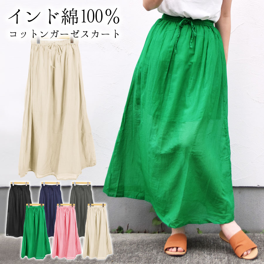 スカート ロング丈 ウエストゴム インド綿 コットン100% Aライン レディース ボトムス 裏地付き 【送料pt100】