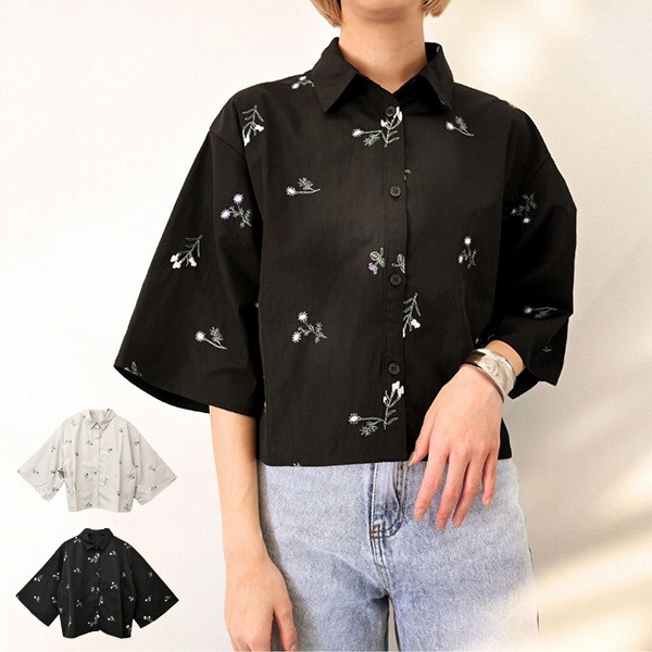 TNタフタ花柄刺繍ハーフスリーブブラウス