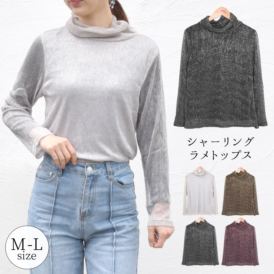 シャーリング ラメ トップス ハイネック タートルネック カットソー レディース 長袖 透け感 【送料pt100】
