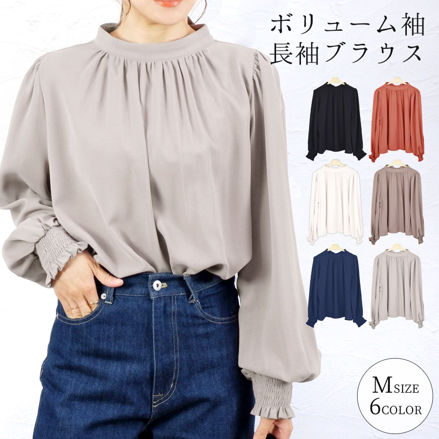 ブラウス レディース 春 夏 オフィス 長袖 ボリューム袖 フリル バックリボン ハイネック 無地 【送料pt100】