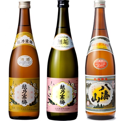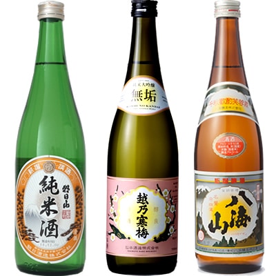 朝日山 純米酒 720ml と 越乃寒梅 無垢 純米大吟醸 720mlと八海山 720ml
