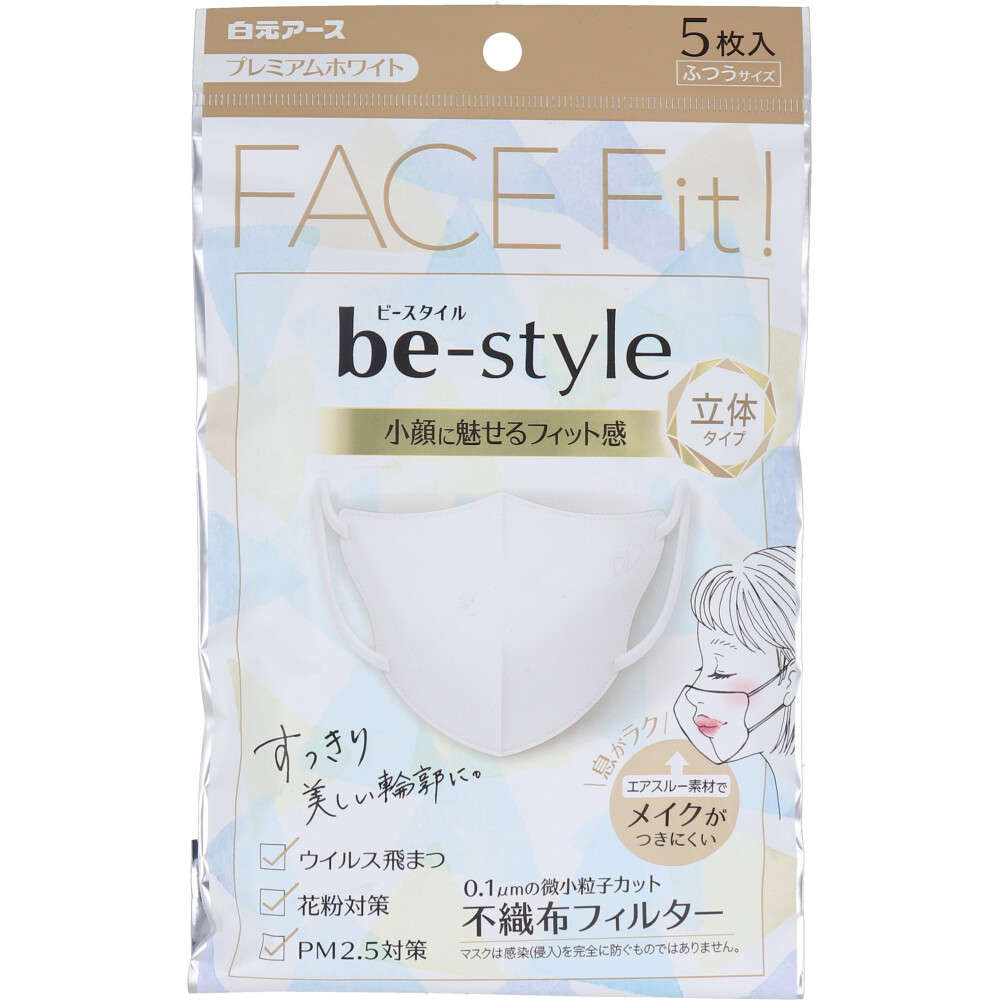 【使い捨てマスク】 ビースタイル 立体タイプ ふつうサイズ プレミアムホワイト 5枚入