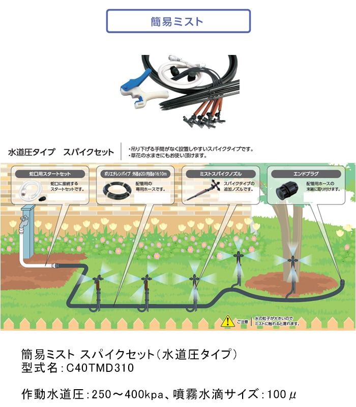 簡易ミスト スパイクセット(水道圧タイプ)型式名:C40TMD310 作動水道圧:250~400kpa、噴霧水滴サイズ:100μ...
