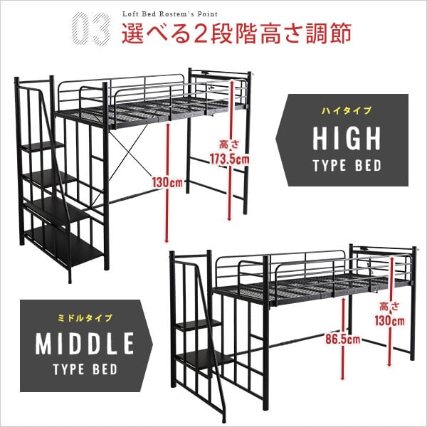 階段付パイプロフトベッド(4色)、ハイタイプでもミドルタイプでも選べる大容量の収納力 | Rostem-ロステム HT70-102...