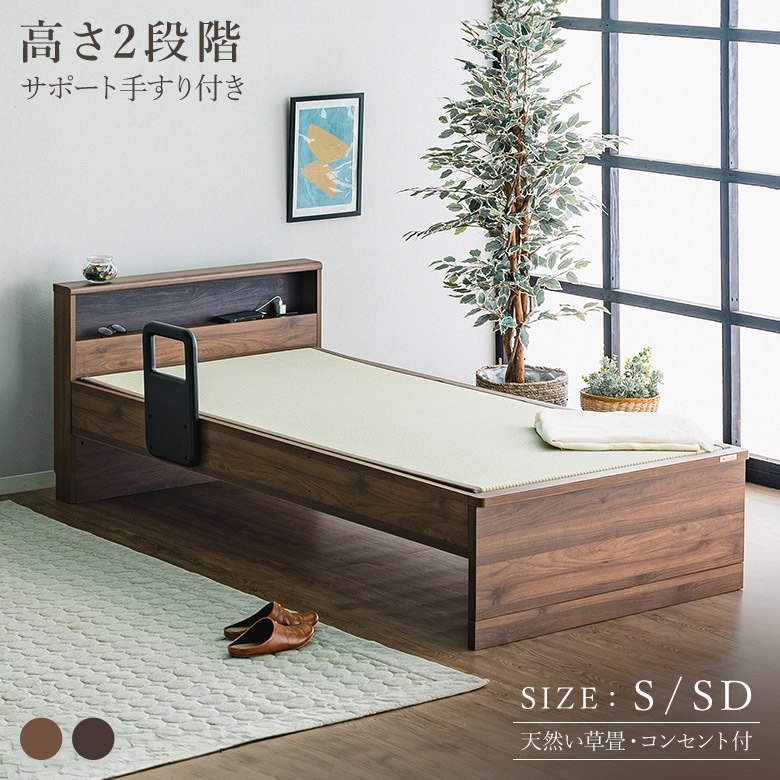 畳ベッド 手すり付き シングル/セミダブル 宮付き コンセント付き 高さ2段階 木製 ブラウン ダークブラウン 天然い草畳 お掃...