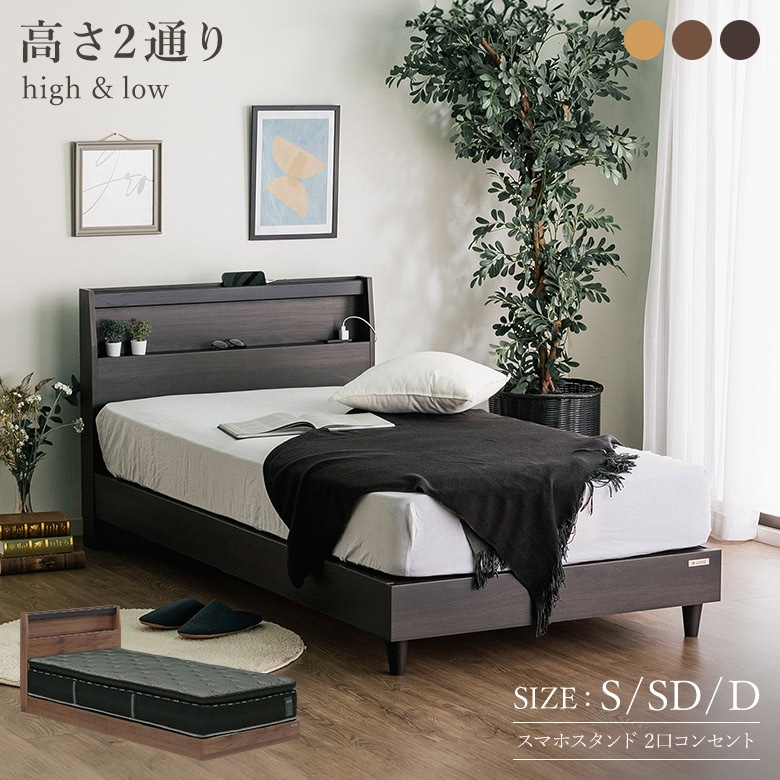 スマホスタンド付きベッドフレーム【ベーシック宮付きタイプ】シングル セミダブル ダブル ベッド 高さ2段階 ハイタイプ ロータイプ...