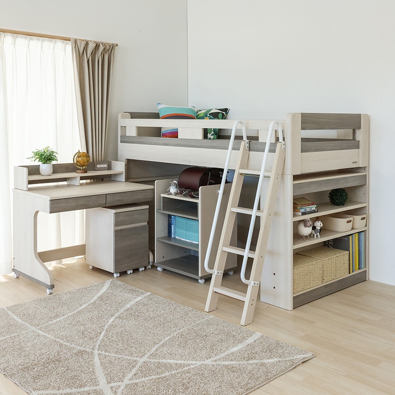 ミドルベッドセット ソラリオ+デスク+上棚+ワゴン+ランドセルラック WH【大型商品配送】※単品販売有