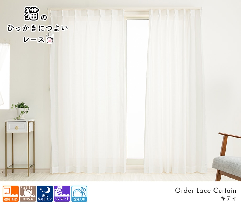 猫爪ひっかき対応 爪が引っかからず傷がつきにくい遮像レースカーテン「キティ」ホワイト
